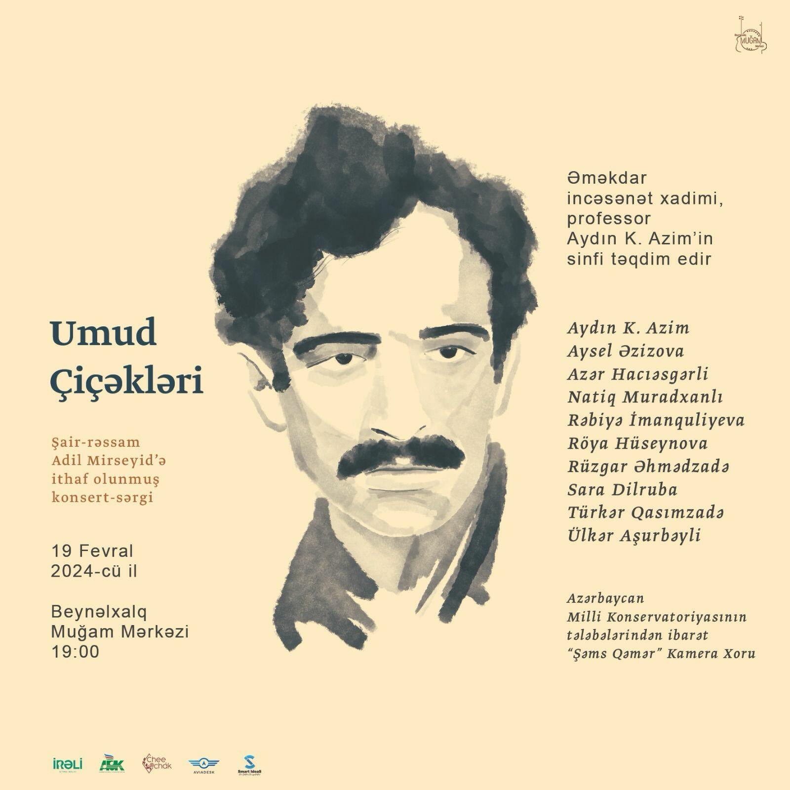 “İRƏLİ” İctimai Birliyinin dəstəyi ilə Əməkdar incəsənət xadimi, bəstəkar Aydın Əzimin sinfinin təqdimatında şair-rəssam Adil Mirseyidin xatirəsinə həsr olunmuş “Umud çiçəkləri” adlı konsert-sərgi keçiriləcək.