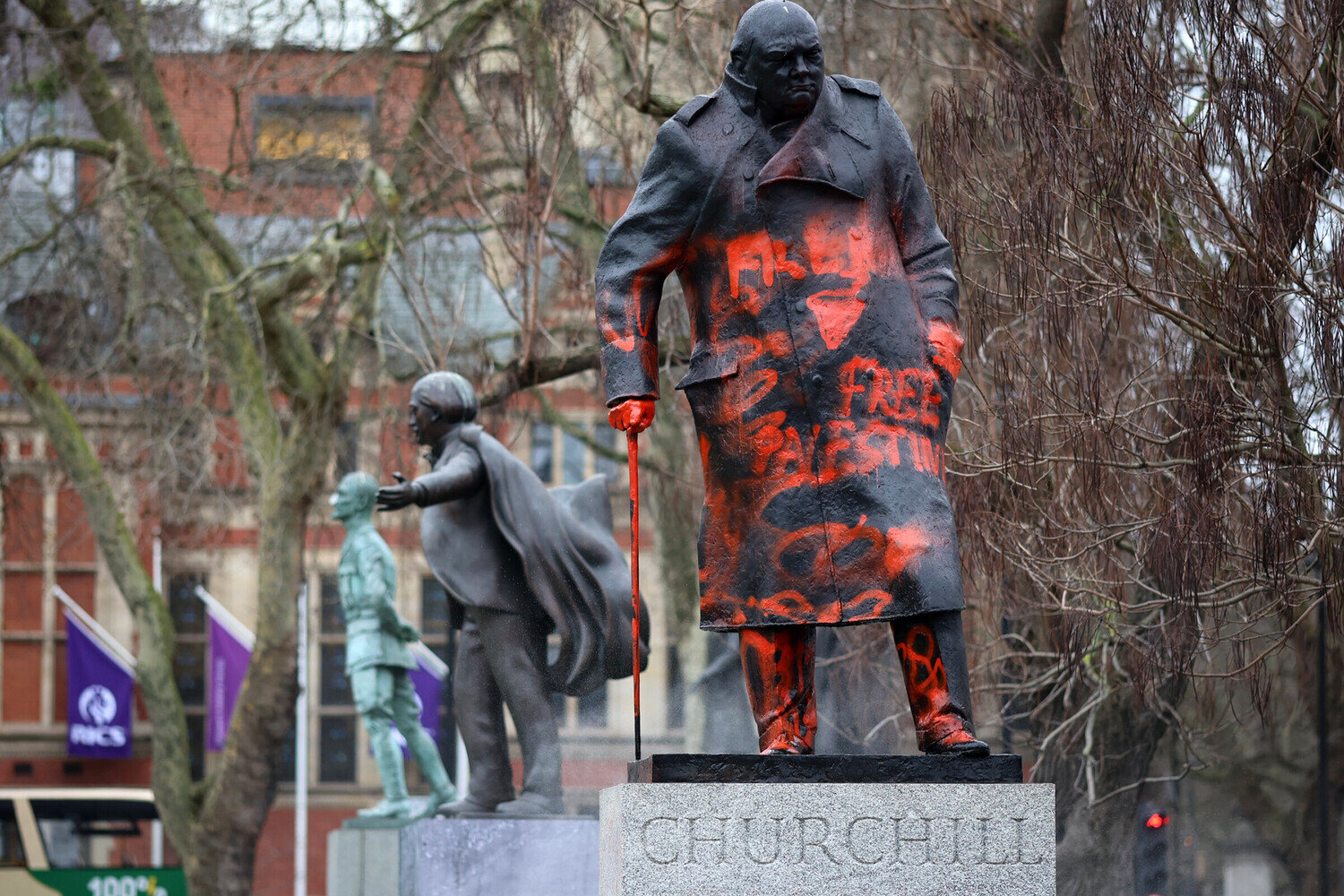Məlumata görə, Fələstin tərəfdarı Londonun mərkəzində yerləşən heykəlin üzərinə qırmızı boya ilə təhqirlər yazıb. Heykələ "Sionist müharibə cinayətkarı" sözlərini yazan şəxs, həmçinin Fələstinin azadlığına çağıran şüarlar da qeyd edib. 38 yaşlı kişi həbs edilib.