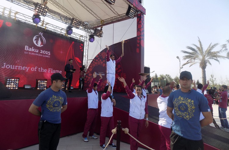 Atletika üzrə Avropa turnirinin qalibi, bir neçə dəfə Azərbaycan çempionu olmuş Fikrət Qafarov məşəli fəvvarə meydanında qurulmuş səhnəyə qaldırdı. F.Qafarov birinci Avropa Oyunlarının məşəlini alovlandırıb.