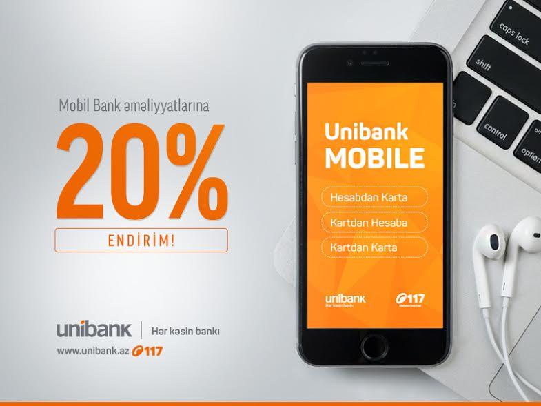Banka gəlmədən Unibank Mobile-la bank əməliyyatı edirsiniz və üstəlik hər əməliyyatda 20% endirim qazanırsınız. Bu imkandan indi Unibank Mobile-la əməliyyat edən hər kəs istifadə edə biləcək. Unibank-ın başladığı kampaniya çərçivəsində Unibank Mobile-la aparılan “hesabdan-karta” ,”kartdan –hesaba” və “kartdan –karta” əməliyyatlarına komissiya haqlarında 20% endirim edilir.