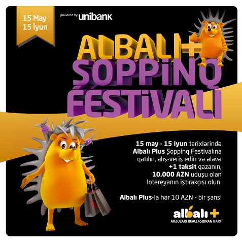 Ölkənin ən öndə gedən, brend mağazaların yerləşdiyi ticarət mərkəzlərində (28 Mall, MetroPark, Park Bulvar və AuraPark (Gəncə ş.) mayın 15-dən iyunun 15-dək ALBALI PLUSla (ALBALI) alış-veriş edin və faizsiz əlavə 1 taksit qazanın. Festival boyu etdiyiniz hər alış-veriş, sizə 10.000 AZN-lik uduş fondu olan lotereyada iştirak etmək və qalib olmaq şansı qazandıracaq.