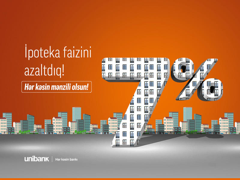 Unibank ipoteka kreditlərinin faizini aşağı saldı. Indi Unibank-a müraciət edənlər dövlət ipoteka kreditlərini illik cəmi 7%-lə əldə edə biləcəklər. İllik faiz dərəcəsinin 8%-dən 7%-ə endirilməsi aylıq ödənişləri aşağı salmaqla, ümumi kreditin məbləğini də daha sərfəli edəcək. Bir müddət əvvəl isə Unibank ipoteka kreditlərində ilkin ödənişi xeyli aşağı salıb. İndi bank filiallarına müraciət edənlər, evin ilkin ödənişinin 20%-ni etməklə illik 7%-lə 100 min manatadək ipoteka krediti götürə bilərlər.