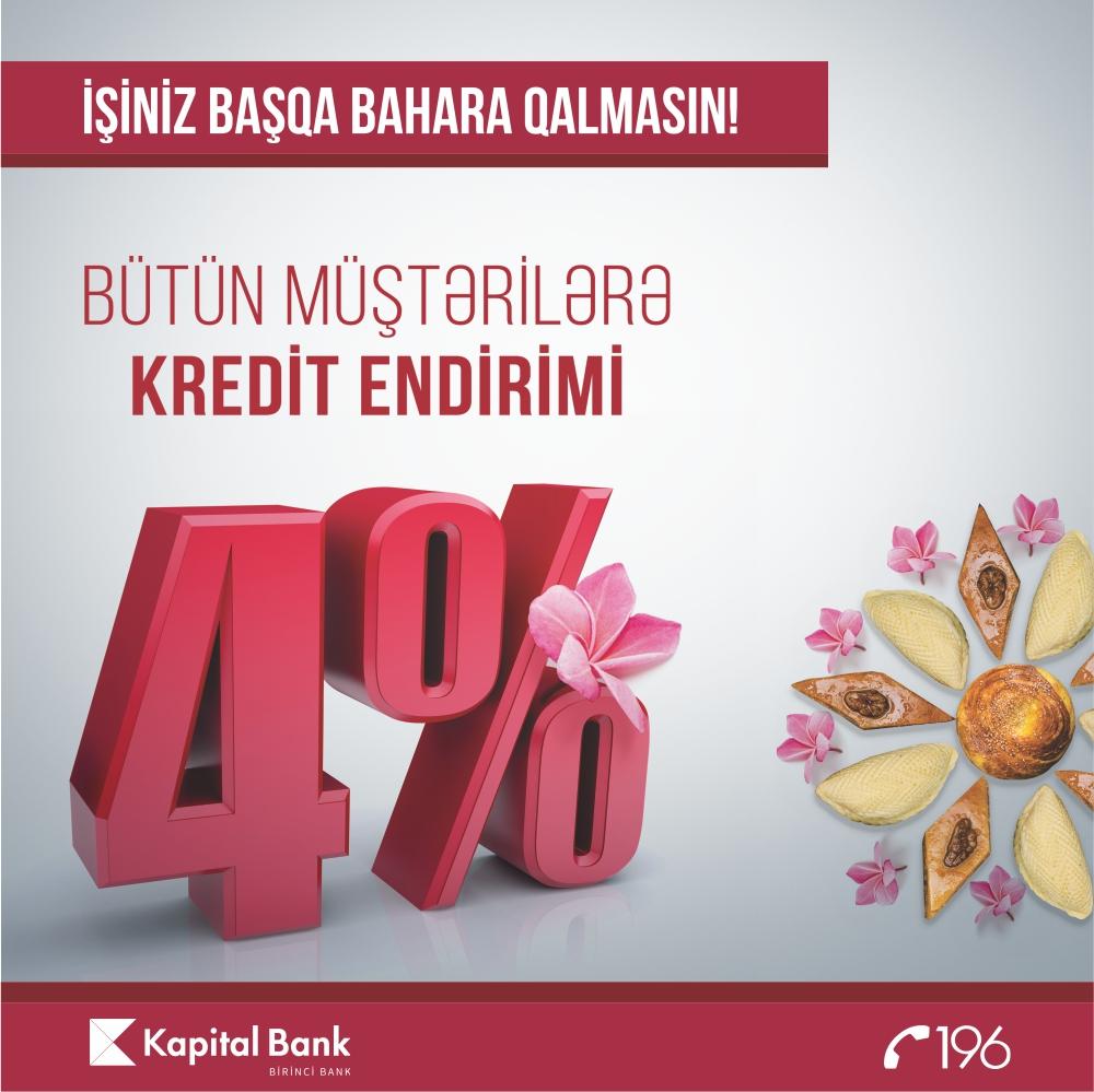 Kapital Bank-ın güzəştli kredit aksiyası davam edir. Aksiya çərçivəsində Kapital Bank-dan kredit götürən hər kəsə illik faiz dərəcəsində 4% endirim edilir. 8 000 AZN-dək olan kreditlər isə zaminsiz verilə bilər. Aksiya 31 mart 2018-ci il tarixədək keçirilir.