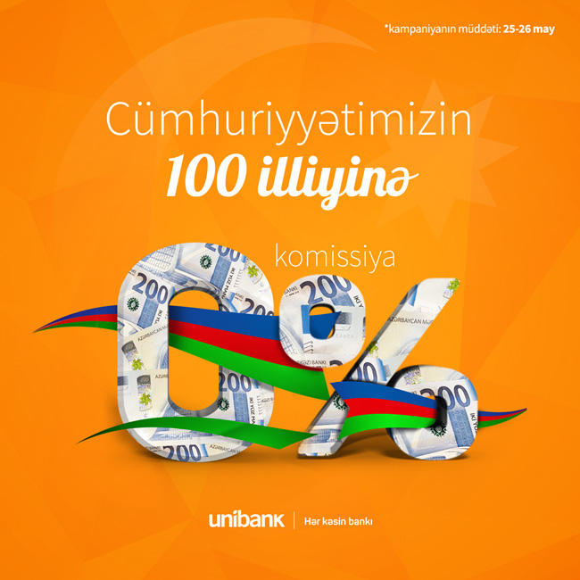 Unibankdan komissiyasız istehlak krediti fürsətini qaçırmayın! 28 May Respublika Günü münasibəti ilə Unibank hər kəs üçün iki günlük komissiyasız nağd istehlak krediti aksiyası keçirir. 25 və 26 may tarixlərində bankın fililallarına gəlin, nağd istehlak kreditlərini 0% komissiya ilə əldə edin!