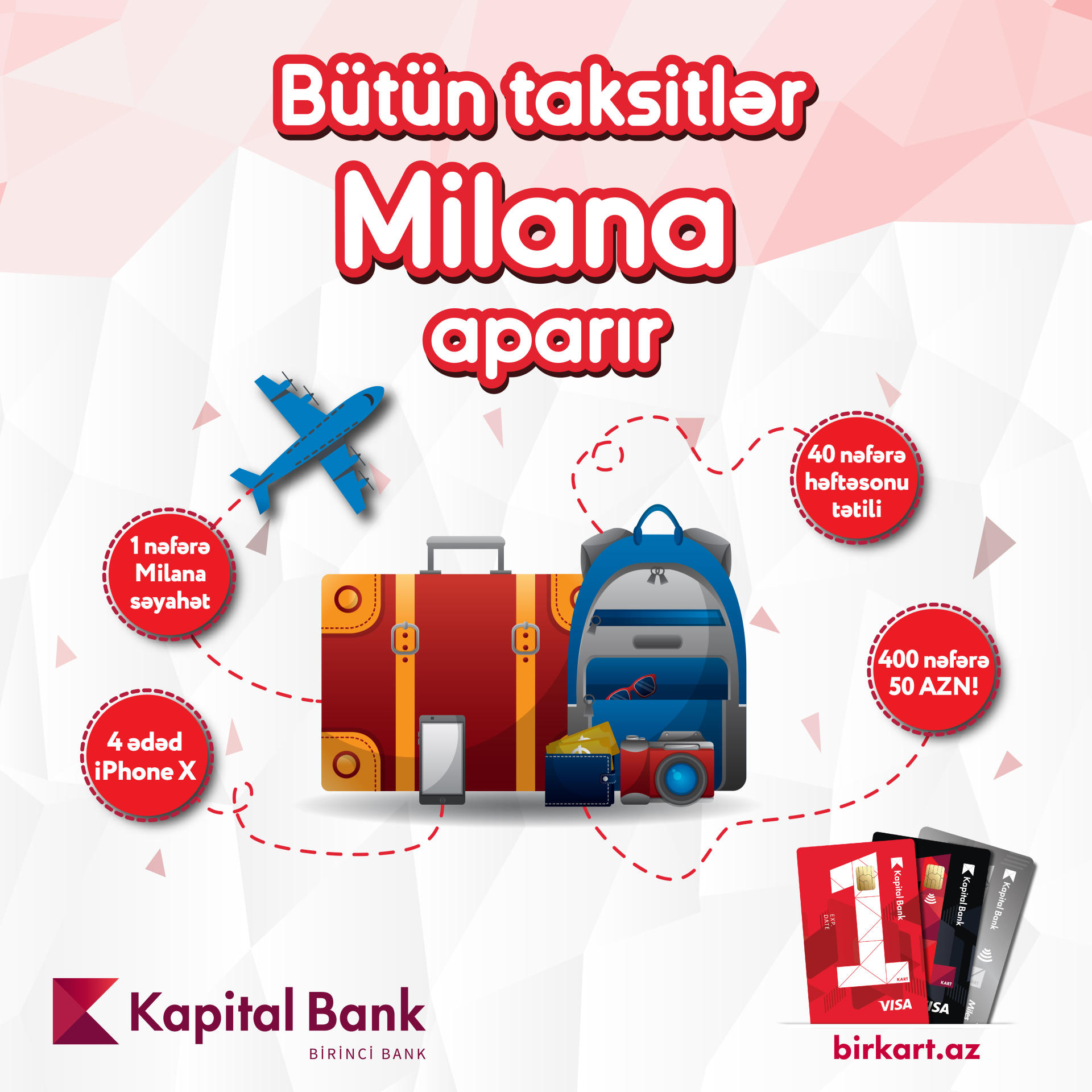 Şərtlərə görə hər taksit əməliyyatı bir şansa bərabərdir. 24 sentyabrda – son tiraj zamanı daha 100 nəfər 50 manat pul, 10 nəfər 300 manatlıq ölkə daxili səyahət sertifikatı və 1 nəfər iPhone X əldə edəcək. 1 nəfər isə əsas hədiyyəni Milana 2 nəfərlik səyahət və 2 000 manat qazanacaq.