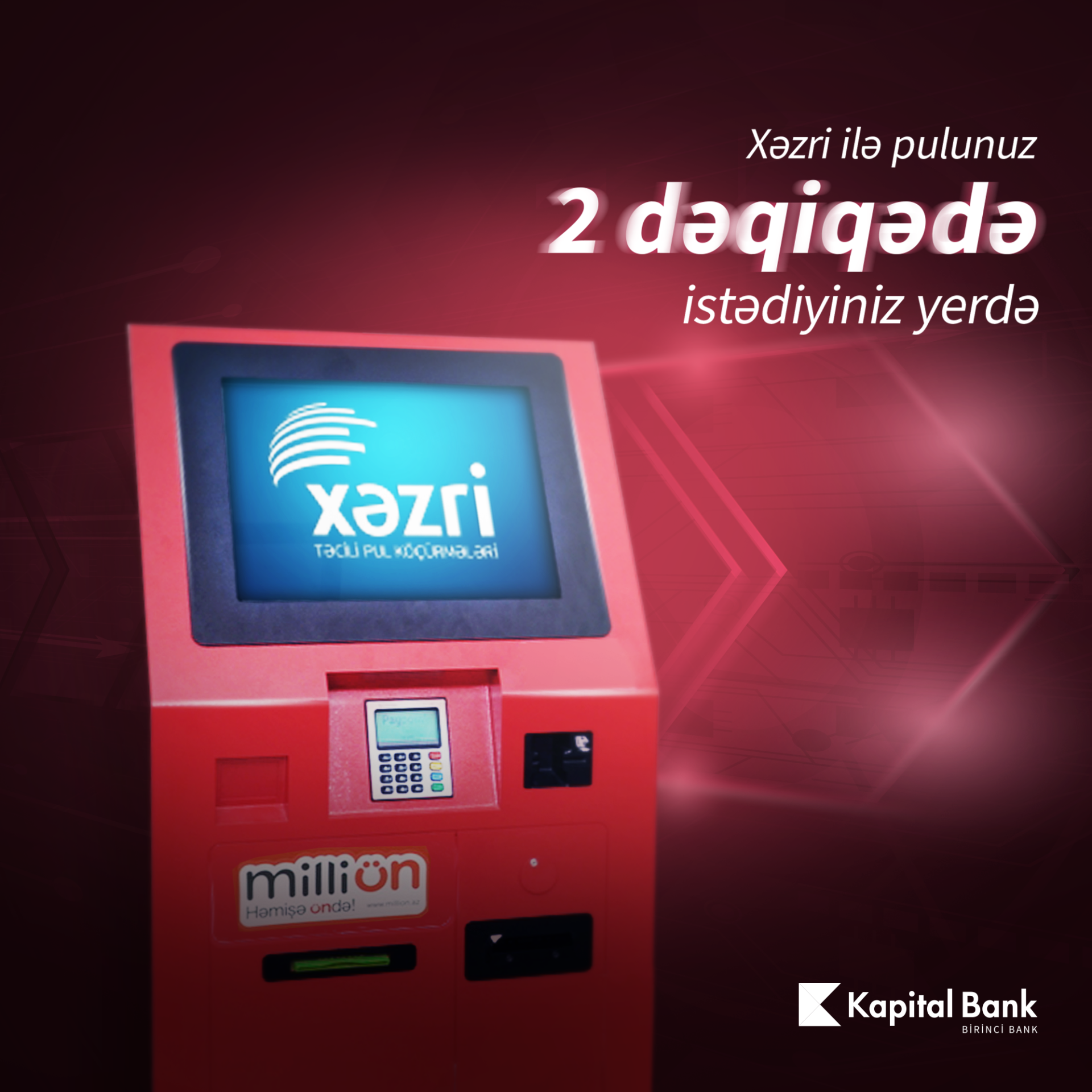 Kapital Bank-ın Xəzri təcili pul köçürmə sistemi ilə ölkə daxilində 1000 AZN-dək pul köçürmə əməliyyatlarının MilliÖn ödəniş terminallarında aparılması mümkündür. Müştərilər ölkə daxili göndərilən pul vəsaitini günün istənilən saatında 600-dən artıq Kapital Bank bankomatlarından və ya sistemin çoxsaylı tərəfdaş bankının filiallarından komissiyasız nağdlaşdıra bilərlər.
