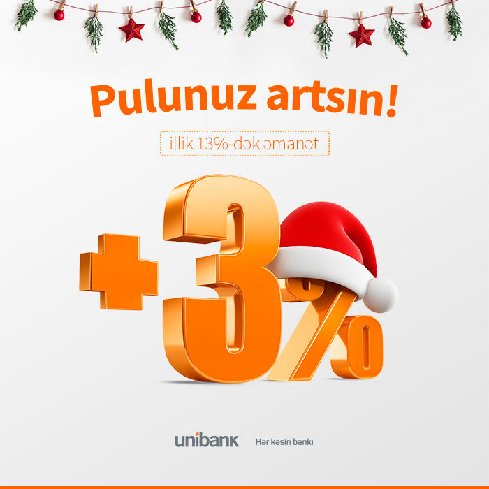 İndi Unibankda əmanət hesabı açmaq daha da sərfəli oldu. Bankın yeni kampaniyası çərçivəsində qoyulan depozitlərlərə Unibank əlavə 3% hədiyyə edir. Yanvarın sonunadək davam edən kampaniya çərçivəsində öz manat vəsaitlərinizi çox yüksək faizlə banka etibar edə bilərsiniz. Unibankın +3% hədiyyə depozit kampaniyası çərçivəsində banka manat depoziti yerləşdirən hər kəsə bankdan illik əlavə 3% hədiyyə ediləcək. Aksiya çərçivəsində “Müddətli” depozitin faiz dərəcəsi müddətin sonuna 13%-ə, “Yığım” depozitinin faiz dərəcəsi ilə illik 11%-ə yüksəlib.