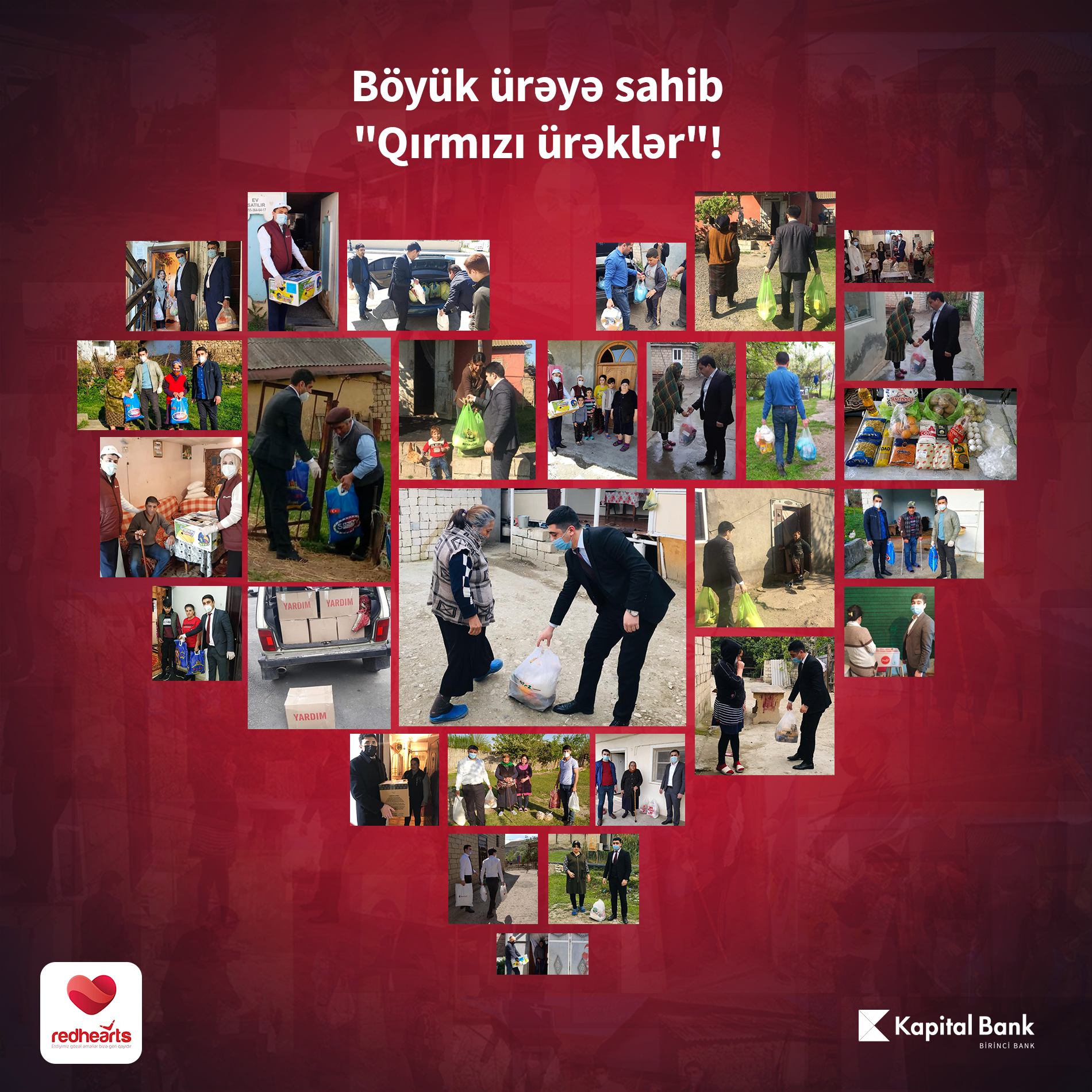 Kapital Bank-ın əməkdaşlarının təşəbbüsü ilə yaradılan “Qırmızı ürəklər” könüllülər qrupu Bakı ilə yanaşı regionlarda da xeyriyyə aksiyaları keçirir, imkansız, çoxuşaqlı ailələri, əlilləri, yaşlı insanları ziyarət edir, onlara ərzaq və gündəlik tələbat məhsulları təqdim edir. Bu günə qədər “Qırmızı ürəklər” ölkənin 50-dək rayonda xeyriyyə aksiyaları təşkil edilib, 1000-ə yaxın aztəminatlı ailələrə yardım göstərilib.