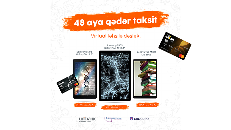 “Unibank”ın da yaxından dəstəyi ilə yalnız müəllim, şagird və tələbələr üçün çox sərfəli bir layihəyə start verilib. Unibank KB , Inteqral QSC və Crocusoft MMC-nin birgə hazırladıqları “Virtual Təhsilə Dəstək” layihəsi çərçivəsində müəllim, şagird və tələbələr noutbuk, planşet və printerləri güzəştli nağd qiymətə və ya dəyərini çox sərfəli şərtlərlə 48 ayadək müddətdə hissə-hissə ödəməklə əldə edə bilərlər. “Unibank”ın Albalı Plus kredit kartı ilə ayda cəmi 20 AZN-dən başlayan ödənişlə noutbukları, 5 AZN-dən başlayaraq planşetləri, 3 AZN-dən başlayan ödənişlə isə printerləri əldə etmək mümkündür.