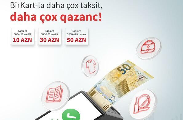 BirKart müştərilərə daha bir qazandıran kampaniya təqdim edir. Artıq geyim, ayaqqabı, parfümeriya, kosmetika, aksesuar və dəftərxana sahəsi üzrə partnyor mağazalarında taksitli alış-veriş etdikdə 50 AZN-dək əlavə vəsait qazanmaq mümkündür. Şərtlərə görə, kampaniya müddətində BirKart sahibləri toplam 300 – 499,99 AZN arası taksit etdikdə 10 AZN, 500 – 999,99 AZN arası taksit etdikdə 30 AZN, 1000 AZN və daha yuxarı məbləğdə taksitli alış-veriş etdikdə isə 50 AZN qazanacaqlar.