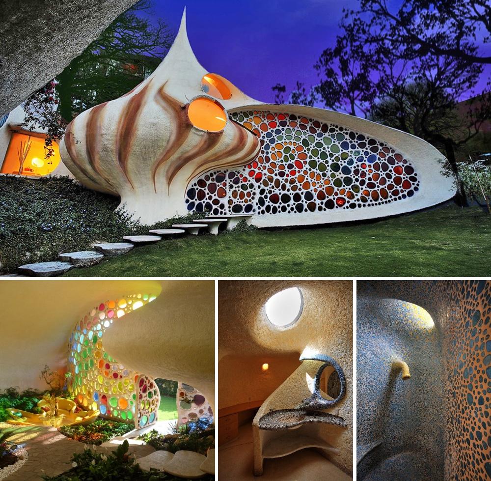 Bu ev təbii memarlığı ilə bioteka estetikasına uyğundur. Müxtəlif rəngli şüşələr vasitəsilə işıq şüaları evi parıltılarla doldurur. Nahamar, möhkəm divarlar zəlzələyə qarşı davamlı hesab edilir.Döşəmədə canlı bitki xalçası var və daşdan cığırlar sizi yaşayış üçün nəzərədə tutulan otaqlara aparır.