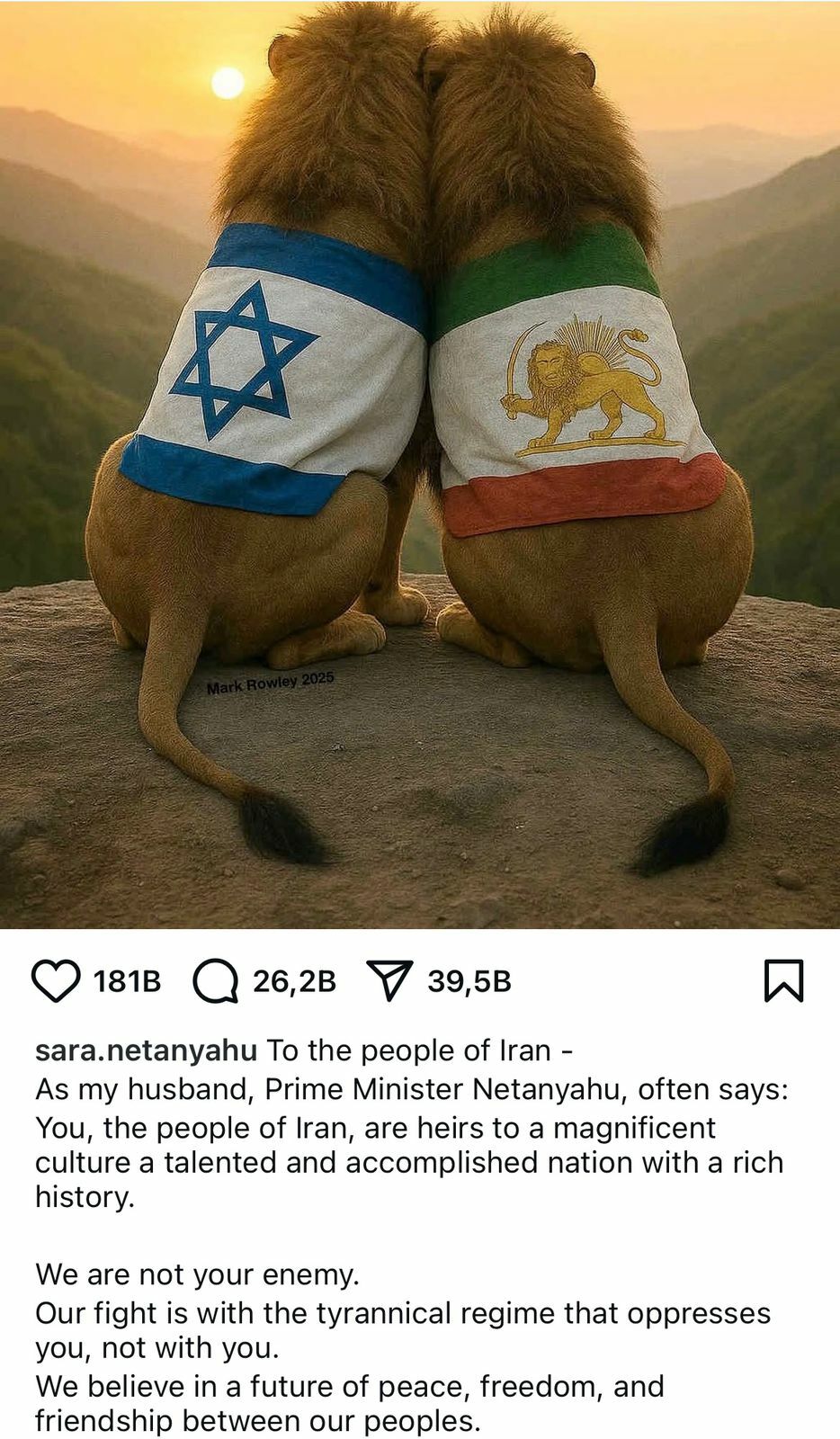 Publika.az xəbər verir ki, İran xalqına müraciət edən Sara Netanyahu "Instagram" hesabında İsrail və Fars İmperiyasının bayraqlarına bürünmüş iki aslan fotosu paylaşıb.