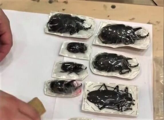 Ekspertiza müəyyən edib ki, bağlamada dünyanın ən böyük gecə böcəyi, demək olar ki, 20 santimetr uzunluğunda olan titan böcəyi, həmçinin lamellicorn ailəsindən olan buğda və kərgədan böcəkləri olub.
