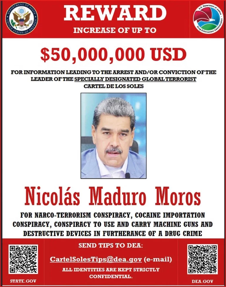Bildirilib ki, ABŞ Maduronun "Cartel de los Soles" narkotik qaçaqmalçılığı dəstəsinin lideri olduğunu iddia edib. Hətta Maduronun həbsinə səbəb olan hər hansı məlumata görə 50 milyon dollar mükafat təklif olunacaq.