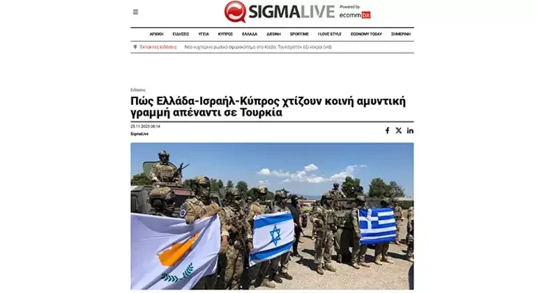 Publika.az xəbər verir ki, Afinanın "Sigma Live" nəşri İsrail və Cənubi Kiprlə müdafiə əməkdaşlığını "Türkiyəyə qarşı ortaq cəbhə" kimi təqdim edən təəccüblü bir təhlil yazısı dərc edib.