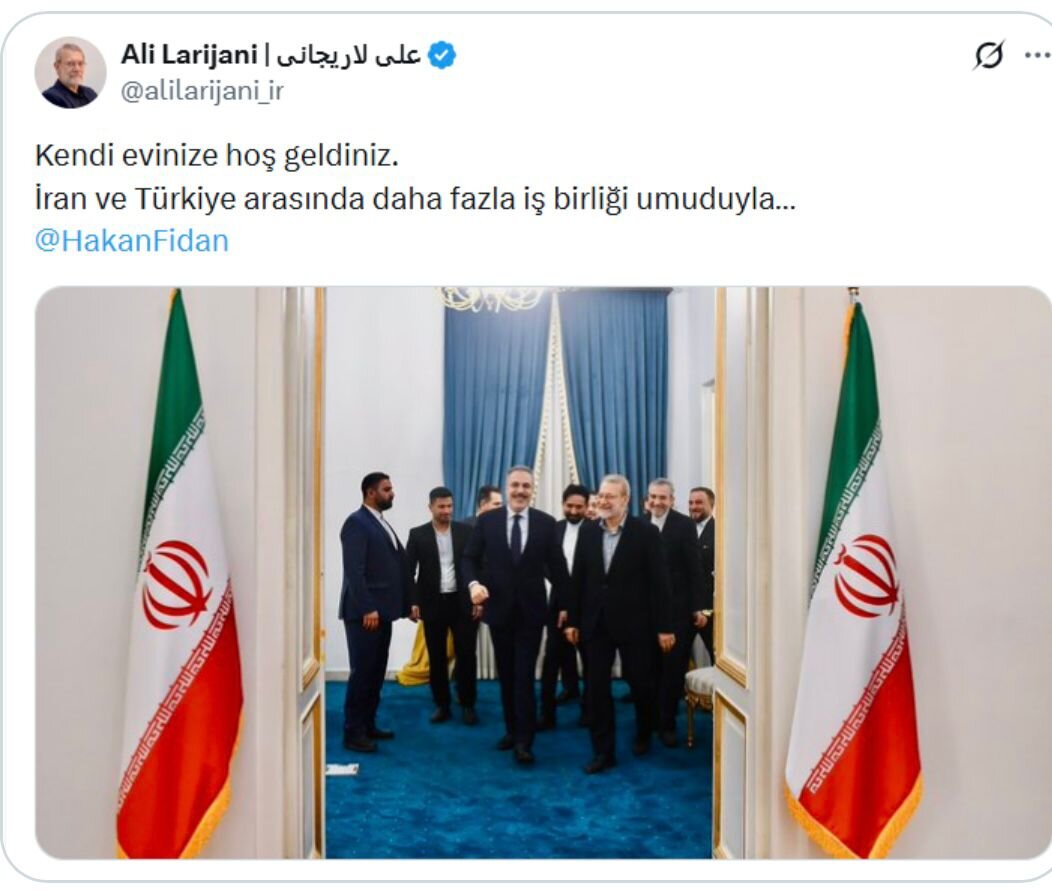 Qeyd edək ki, Laricani bununla bağlı “X” hesabında türk dilində paylaşım edib: "Öz evinizə xoş gəlmisiniz. Türkiyə və İran arasında əməkdaşlığın artmasını ümid edirəm".