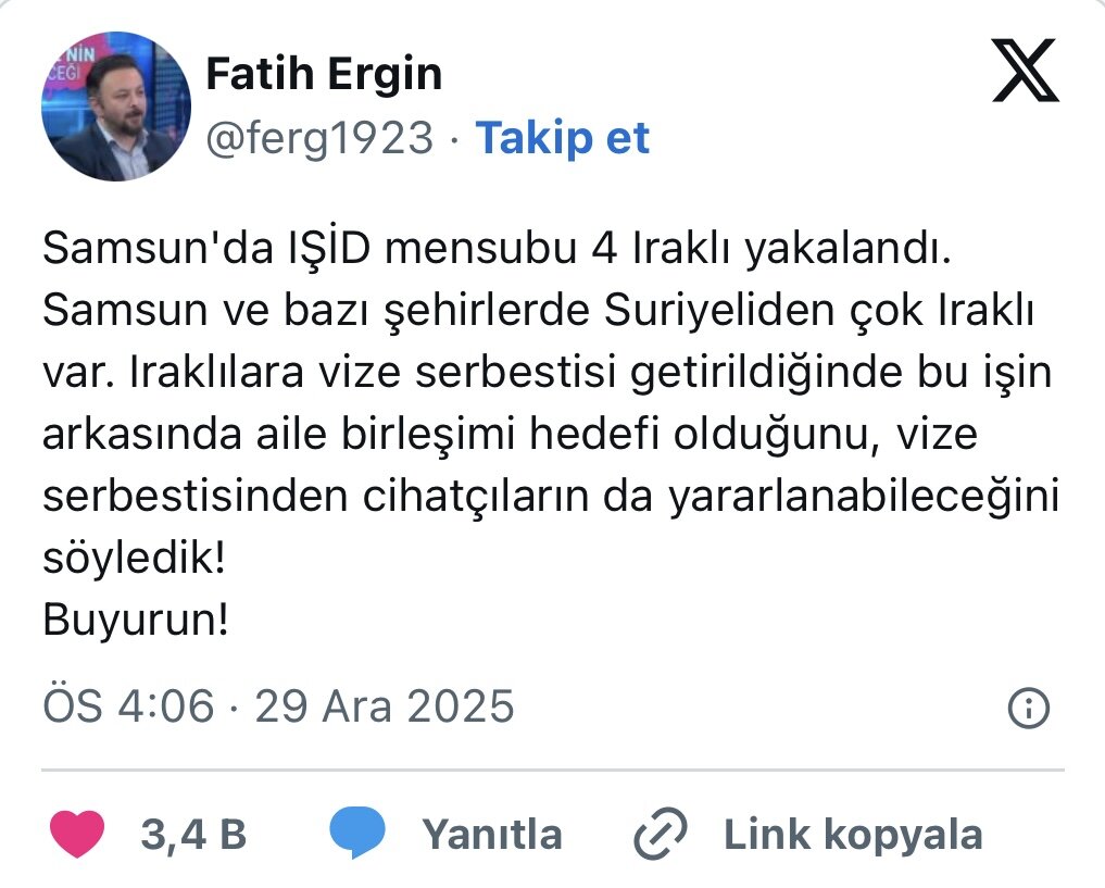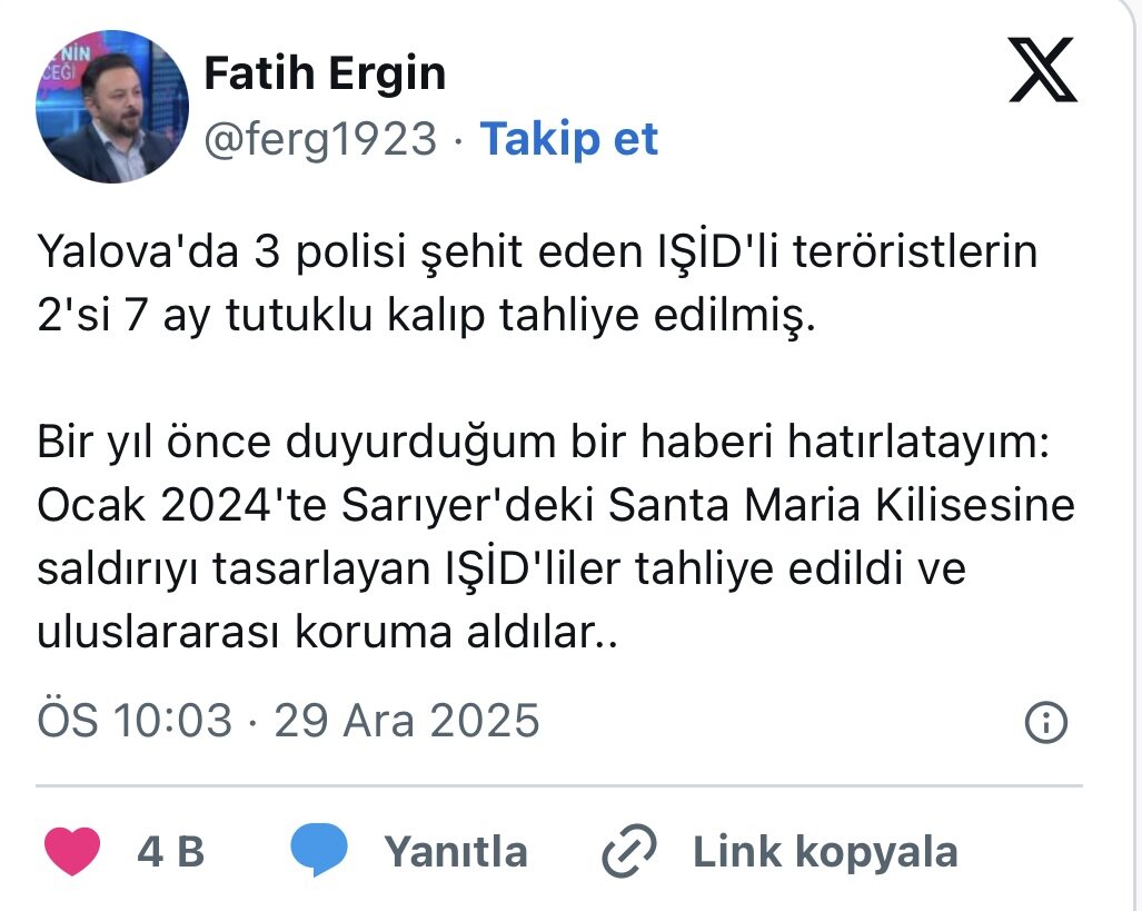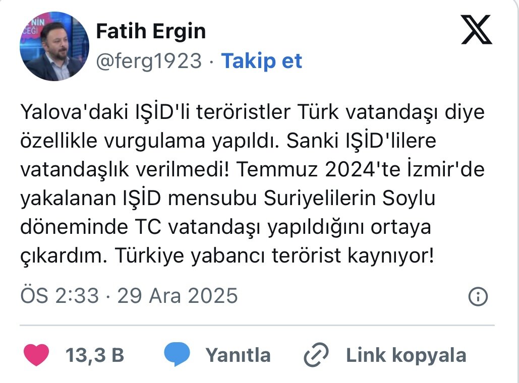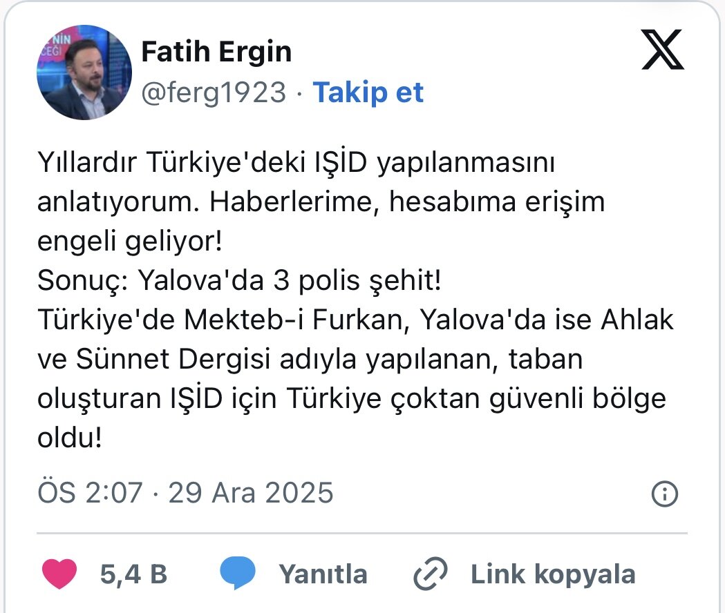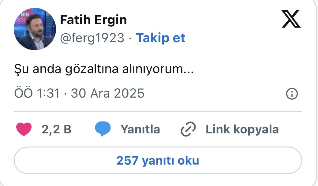 Ehtimal olunur ki, Erginin dünən Yalovada polislə İŞİD terrorçuları arasında saatlarla davam edən və 3 polisin şəhid olması ilə nəticələnən qarşıdurma ilə bağlı “X” hesabındakı paylaşımlarına görə saxlanılıb.
