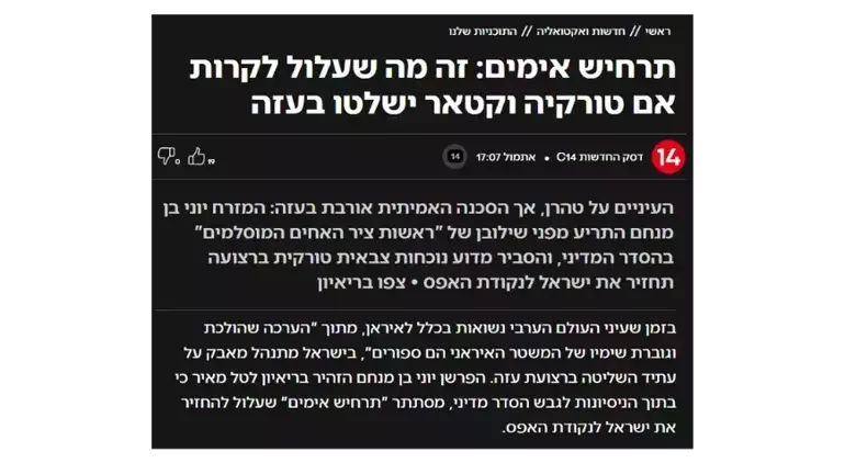 İsrailin "Kanal 14" telekanalına əsasən, diqqət Tehrana yönəlsə də, əsl təhlükənin Qəzzada olduğu barədə xəbərdarlıq edilib. Bildirilib ki, Qəzza zolağında Türkiyə hərbi mövcudluğu İsraili "sıfır nöqtəsinə" qaytaracaq.
