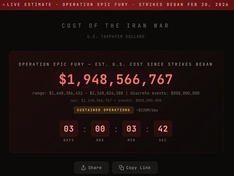 “İran müharibəsinin dəyəri” (“Cost of the Iran War”) adlı yeni sayt fəaliyyətə başlayıb. Resurs 28 fevralda ABŞ-ın Yaxın Şərqdə başladığı hərbi əməliyyatın maliyyə xərclərini real vaxt rejimində hesablayır.