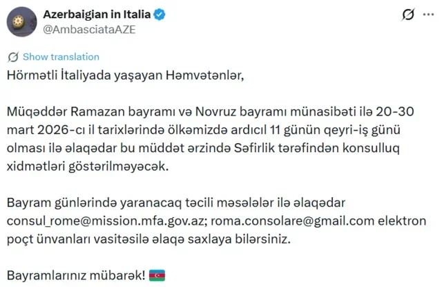 "Müqəddər Ramazan bayramı və Novruz bayramı münasibətilə 20-30 mart 2026-cı il tarixlərində ölkəmizdə ardıcıl 11 günün qeyri-iş günü olması ilə əlaqədar bu müddət ərzində səfirlik tərəfindən konsulluq xidmətləri göstərilməyəcək".