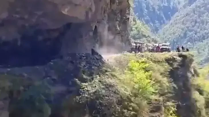 Publika.az xəbər verir ki, sosial mediada yayılan görüntülərə əsasən, yol kənarında yerləşən nəhəng qaya parçası saniyələr ərzində qəfil çökərək uçuruma yuvarlanıb.