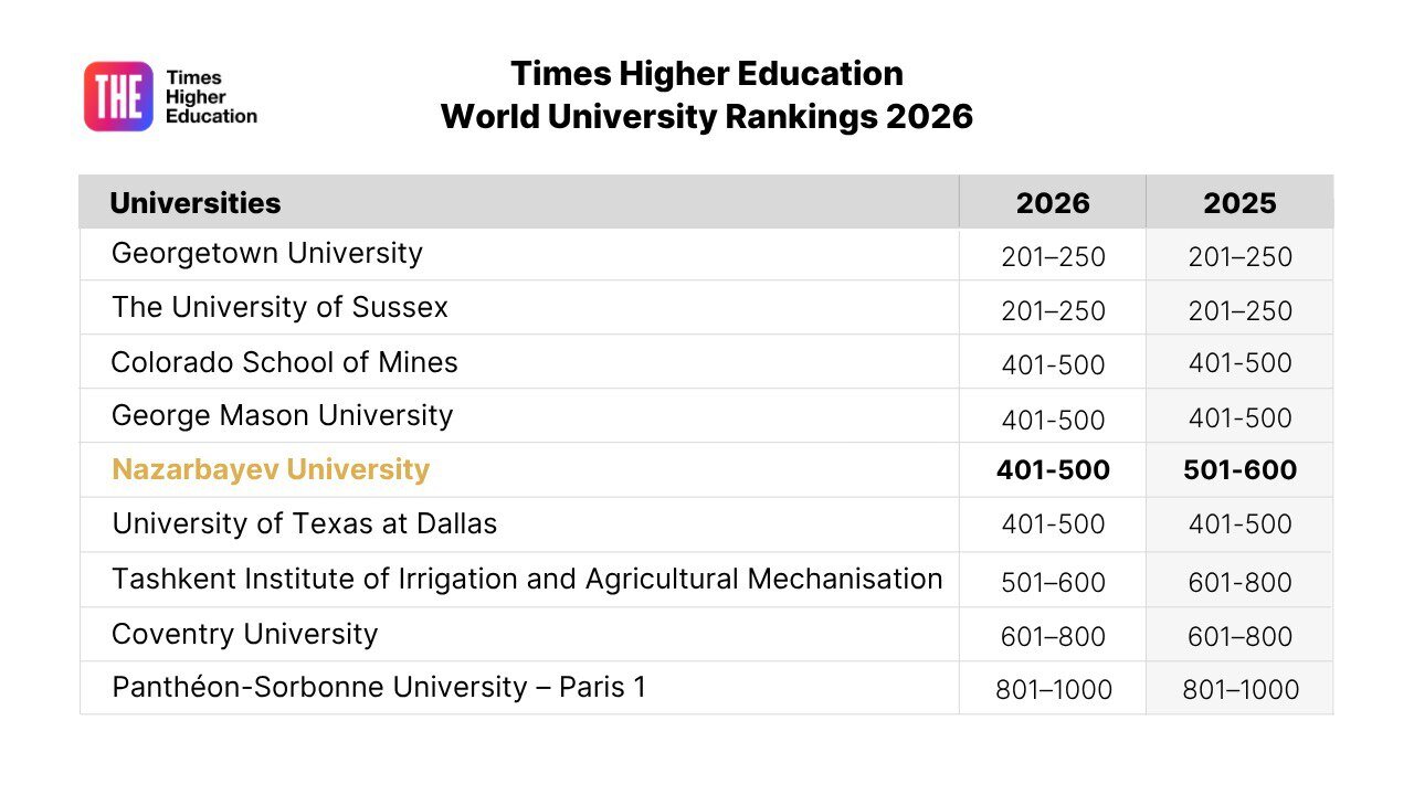 NU beynəlxalq miqyasda mövqeyini davamlı şəkildə gücləndirir və Times Higher Education (THE) WUR 2026 reytinqinə əsasən Mərkəzi Asiya və Qafqazda 1-ci, MDB ölkələri arasında isə 4-cü yerə yüksələrək 401–500 aralığında qərarlaşıb.