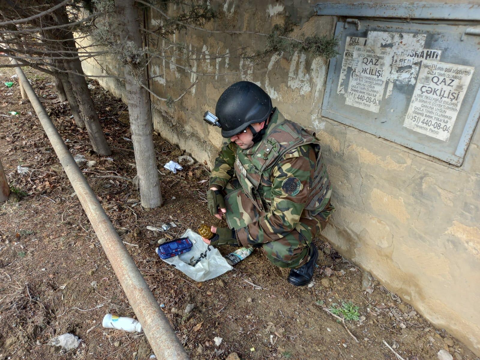 Hüquq-mühafizə orqanı əməkdaşları ilə birgə ərazidə müvafiq təhlükəsizlik tədbirləri görüldükdən sonra hadisə yerinə baxış zamanı aşkar edilmiş sursatın döyüş tətbiqinə yararlı bir ədəd F-1 əl qumbarası və 1 ədəd UZRQM partladıcısı olduğu müəyyən edilib.