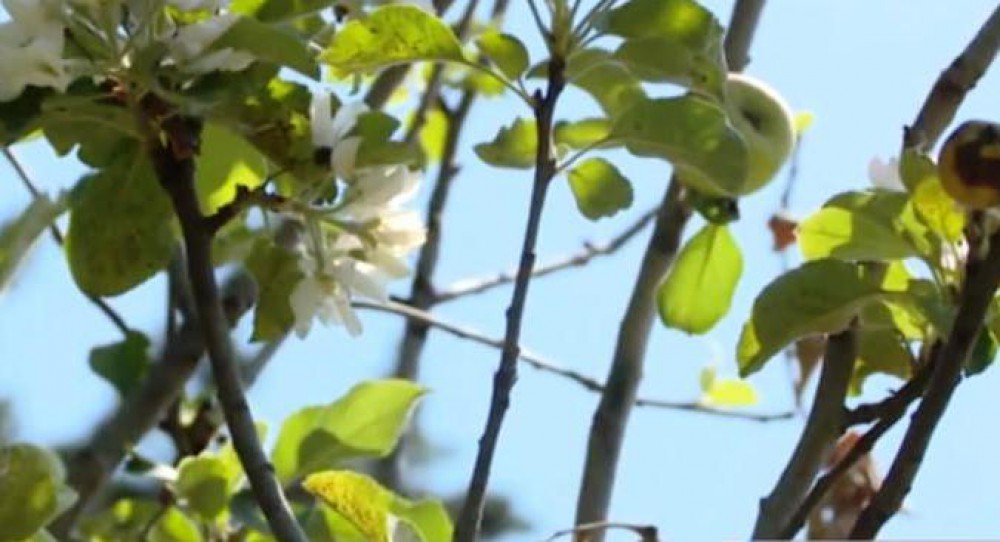 Alma ağacı həm bar verib, həm də yeni çiçək açıb