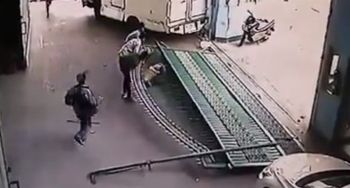 Harada çəkildiyi məlum olmayan görüntüdə 2 nəfər hərəkətdə olan yük maşınını saxlamağa çalışır. Maşın fabrikin dəmir qapısına dəyən kimi darvaza yerindən oynayır və açılır. Ağır qapı 2 nəfərdən birinin üzərinə düşür. Bəxtsiz qəza təhlükəsizlik kamerasına düşüb.