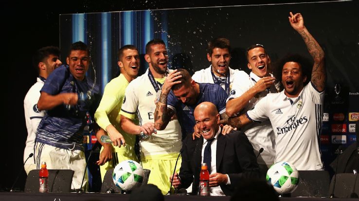 Publika.az xəbər verir ki, madridli futbolçular konfrans zalına daxil olaraq Zidanın başına yığışıblar və onu isladıblar. “Çempionlar, Çempionlar” qışqırıqlarıyla zala daxil olan futbolçular mətbuat konfransınının işini pozub.