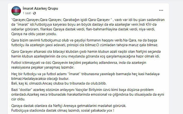 Publika.az xəbər verir ki, “Qarabağ” fanatları “Neftçi” ilə matçın (0:4) gedişində meydan sahiblərinin futbolçusu, Ağdam təsmilçsinin sabiq üzvü Qara Qarayevin ünvanına səslənən qeyri-etik şüarlara görə tənqid olunmalarına münasibət bildiriblər. “İmarət” futbolçunun təhqir edilməsinə haqq qazandırıb:
