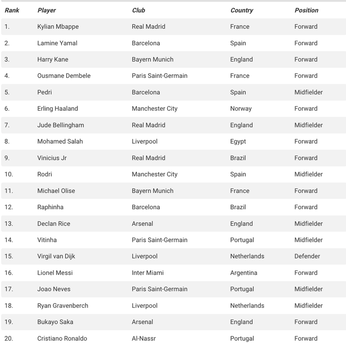 2025-ci ilin “Qızıl top” sahibi Usman Dembelenin adı bu dəfə dördüncü yerdədir, "beşliy"i isə “Barselona”nın yarımmüdafiəçisi Pedri bağlayır.