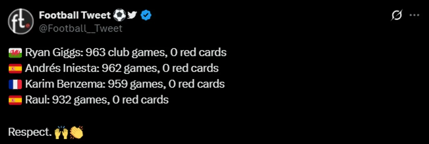 Rayan Giqqz bütün karyerasını “Mançester Yunayted”də keçirib və klubda keçirdiyi 963 oyunda heç vaxt qırmızı vərəqə almayıb.