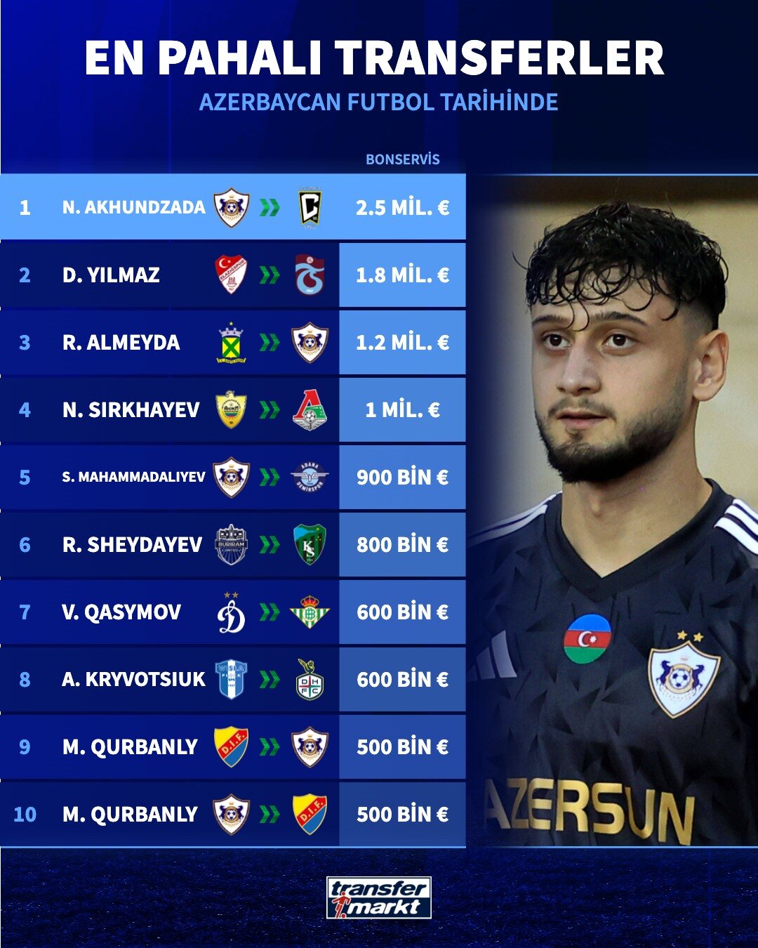 Ramil Şeydayev 2023-cü ildə "Buriram Yunayted"dən "Kocaelispor"a 800 min avroya, Vəli Qasımov 1992-ci ildə Moskva "Dinamo"sundan "Betis"ə 600 min avroya, Anton Krivotsyuk 2022-ci ildə "Visla Plok"dan "Daejeon Hana" klununa 600 min avroya, Musa Qurbanlı 2023-cü ildə "Qarabağ"dan "Dyuqarden"ə 500 min avroya keçib.