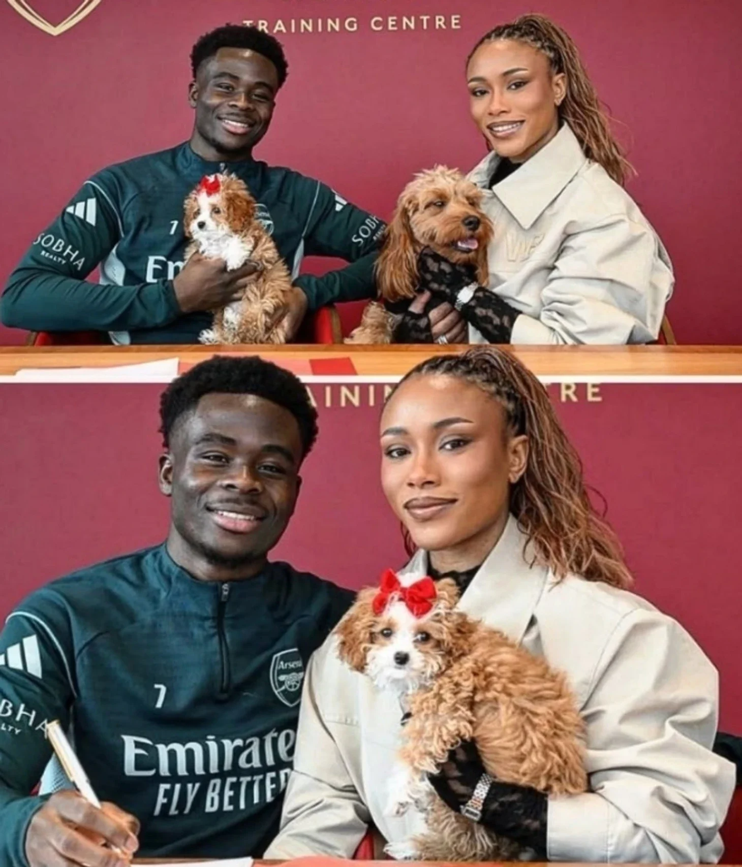 Saka yeni müqaviləni imzalamağa həyat yoldaşı və itləri ilə gəlib.