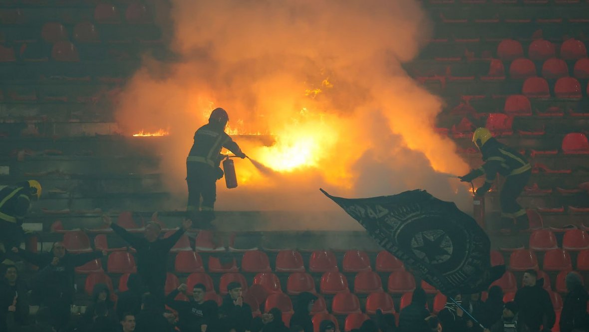 Matç 56-cı dəqiqədə dayandırılıb, çünki “Partizan” azarkeşlərinin sektoru alovlanıb. Fanatlar oturacaqları yandırıblar və bu, hakimi oyunu müvəqqəti dayandırmağa məcbur edib. Yanğınsöndürənlər hadisəyə tez müdaxilə edərək alovu söndürüblər və oyun 8 dəqiqə sonra bərpa olunub.