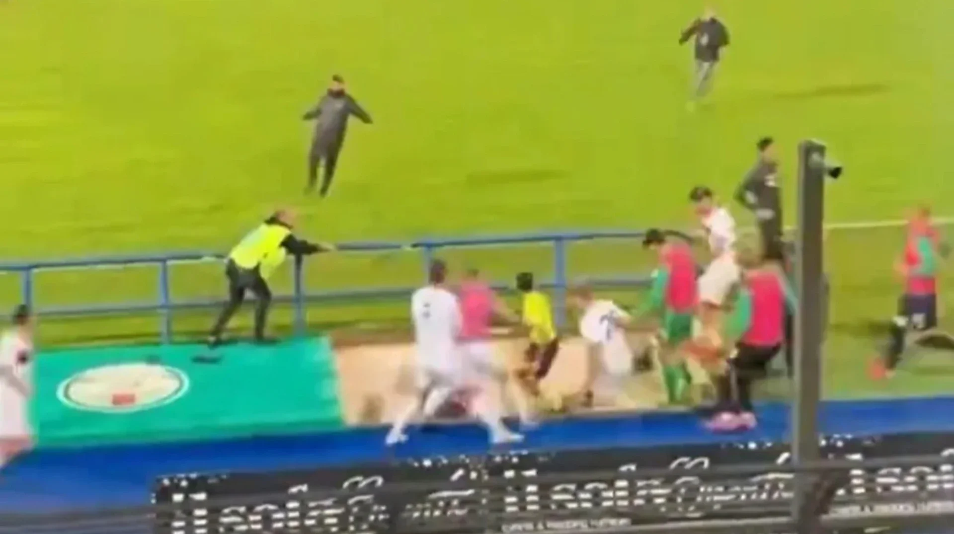Qonaq azarkeşlərdən bəziləri balaklava və kapüşonla örtülü şəkildə meydana çıxaraq təqib səhnələrini xatırladan anlar yaşadıb. Futbolçular tələsik meydanı tərk edib, reklam lövhələrinin arxasında gizlənməyə və ya paltardəyişmə otaqlarına qaçmağa çalışıblar ki, izdihamla birbaşa təmasdan qaçsınlar.