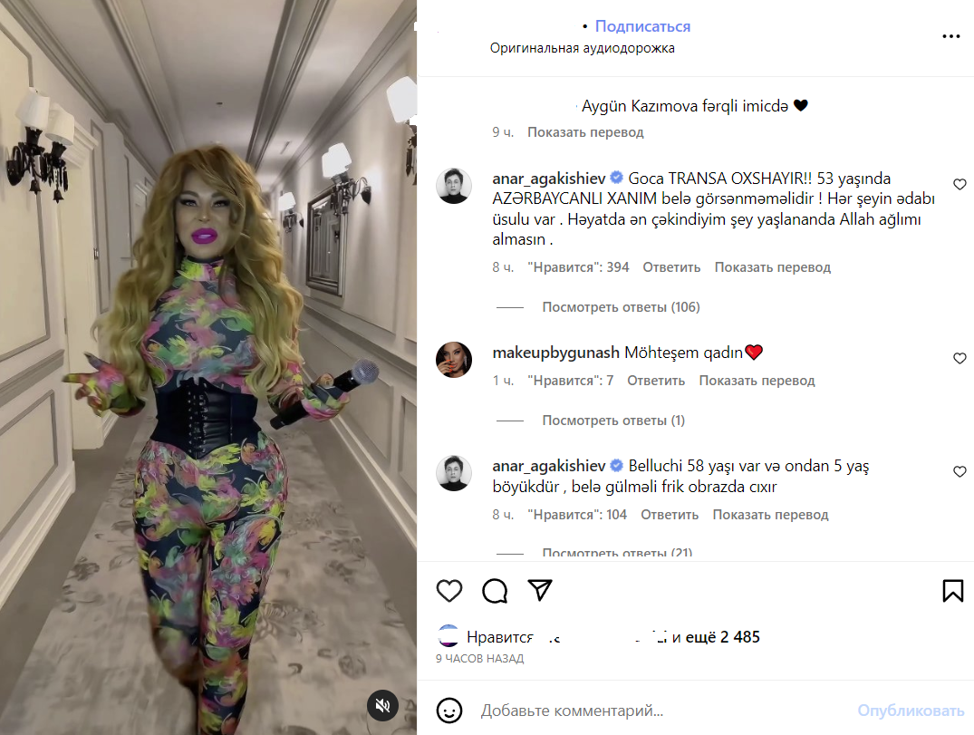 Publika.az xəbər verir ki, o, instaqram səhifələrinin birində müğənninin videosuna şərh yazıb: “Qoca transa oxşayır! 53 yaşında azərbaycanlı xanım belə görünməməlidir! Hər şeyin ədabı-üsulu var. Həyatda ən çəkindiyim şey - Yaşlananda Allah ağlımı almasın”.