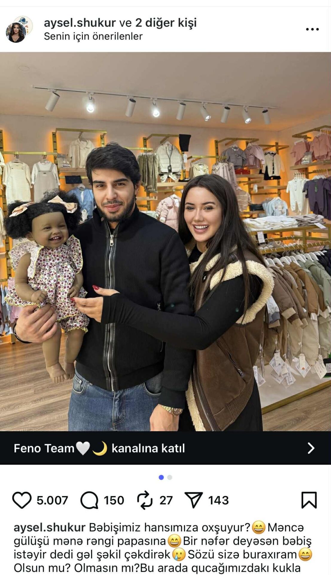 "Bəbişimiz hansımıza oxşayır? Məncə, gülüşü mənə, rəngi isə atasına oxşayır. Bir nəfər deyəsən bəbiş istəyir, dedi ki, gəl şəkil çəkdirək. Sözü sizə buraxıram. Olsunmu? Olmasınmı?"