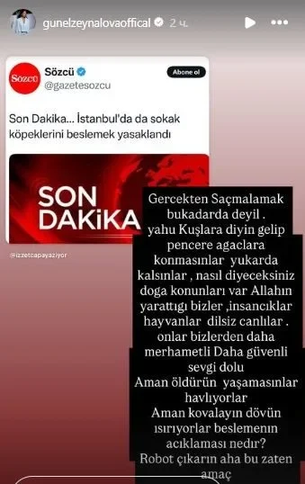 Müğənni Günel Zeynalova Türkiyədə küçə itləri ilə bağlı verilən qərara etiraz edib.