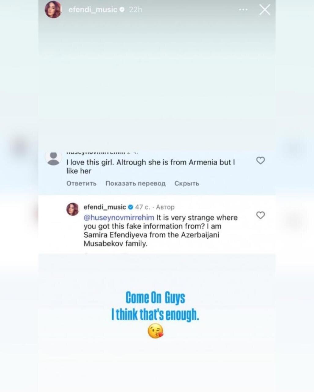 Publika.az xəbər verir ki, izləyicilərdən biri müğənninin paylaşımının altına "Bu qızı sevirəm. O, Ermənistandandır, amma yenə də sevirəm" məzmununda rəy yazıb.