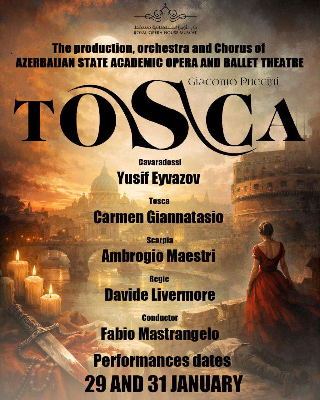 Publika.az xəbər verir ki, tamaşada əsas partiyada Azərbaycanın Xalq artisti Yusif Eyvazov çıxış edəcək. Eyni zamanda səhnə əsəri Azərbaycan Dövlət Akademik Opera və Balet Teatrının simfonik orkestri və xorunun müşayiəti ilə təqdim ediləcək. Azərbaycan kollektivinin dünyanın nüfuzlu opera məkanlarından hesab olunan “Royal Opera House Muscat” səhnəsində çıxışı milli opera sənətinin beynəlxalq səviyyədə təmsili baxımından əhəmiyyətli hadisədir. Qeyd edək ki, bu opera evi Ərəb dünyasında ölçüsünə görə ikinci ən böyük opera teatrı hesab olunur. Dünya opera irsinin tanınmış əsərlərindən olan “Toska” operasının Maskatda Azərbaycan Dövlət Akademik Opera və Balet Teatrının iştirakı ilə təqdim olunması milli opera məktəbinin yaradıcı potensialını və beynəlxalq etimadı nümayiş etdirir. Tamaşada Floriya Toska rolunu italyan soprano Carmen Giannattasio, Mario Kavaradossi rolunu tenor Yusif Eyvazov, Baron Skarpia rolunu isə tanınmış bariton Ambrogio Maestri ifa edir. Bununla yanaşı, operada Azərbaycan Dövlət Akademik Opera və Balet Teatrının digər solistləri də müxtəlif rollarda çıxış edərək səhnə heyətinin bədii bütövlüyünü təmin edirlər. Tamaşanın səhnə quruluşu Davide Livermore, musiqi rəhbərliyi isə dirijor Fabio Mastrancelonun rəhbərliyi ilə həyata keçirilir. Xatırladaq ki, “Royal Opera House Muscat” Sultan Qabus bin Səidin təşəbbüsü ilə 2011-ci ildə fəaliyyətə başlayıb və Yaxın Şərqin aparıcı mədəniyyət mərkəzlərindən hesab olunur.