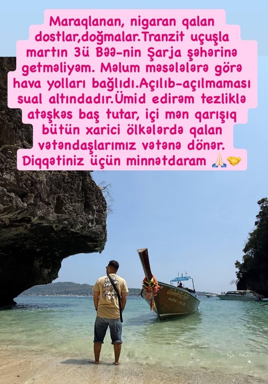 "Maraqlanan, nigaran qalan dostlar, doğmalar. Tranzit uçuşla martın 3-ü BƏƏ-nin Şarja şəhərinə getməliyəm. Məlum məsələlərə görə hava yolları bağlıdı. Açılıb-açılmaması sual altındadır. Ümid edirəm tezliklə atəşkəs baş tutar, içi mən qarışıq bütün xarici ölkələrdə qalan vətəndaşlarımız vətənə dönər. Diqqətiniz üçün minnətdaram" .