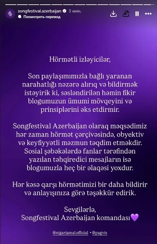 Səhifə isə bununla bağlı Nigar Camaldan hekayə bölümündə üzr istəyib. (OLAY)