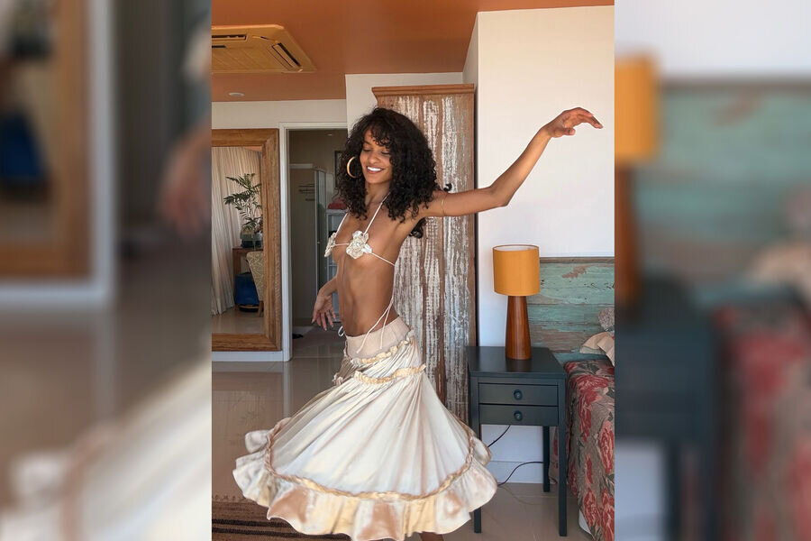 29 yaşlı Nara Baptista kamera qarşısına keçərək güllü büstqalter və xüsusi ətəyi olan donla poza verib. O, həmçinin qalın qızıl sırğalar və bilərziyi ilə də diqqət çəkib. Modelin saç düzüm sadə, makiyajı isə təbii olub. Məşhurun şəkli yataq otağında çəkilib.