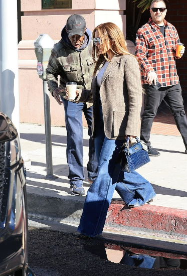 56 yaşlı Cennifer Lopes cins şalvar, ağ top və qəhvəyi pencəkdə görüntülənib. Onun obrazını eynək və "Hermès Kelly Sellier" çantası tamamlayıb.