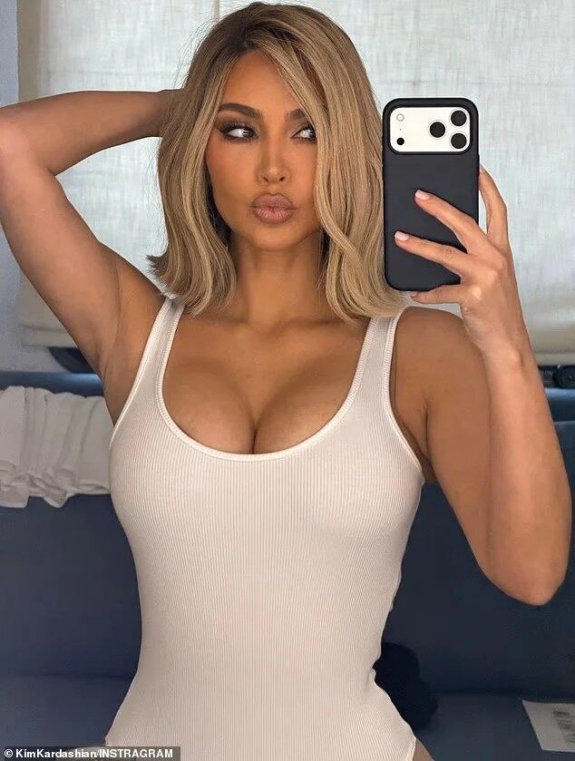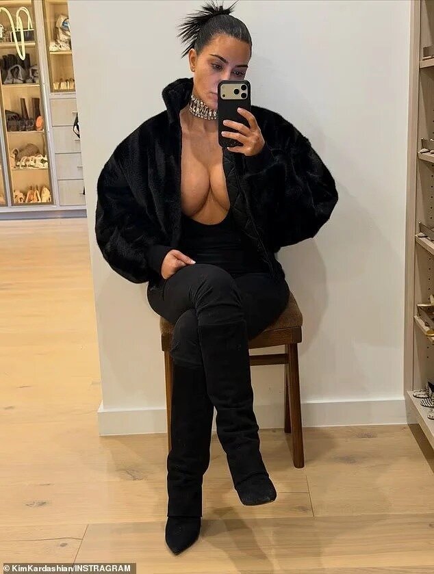 Paylaşım güzgüdə çəkilmiş selfi fotosu ilə başlayır. Burada Kim geniş sinə dekoltesini nümayiş etdirib və həmişəki kimi tünd saçlarını qısa qızılı pariklə örüb.