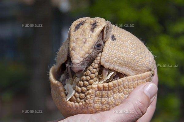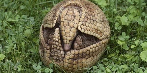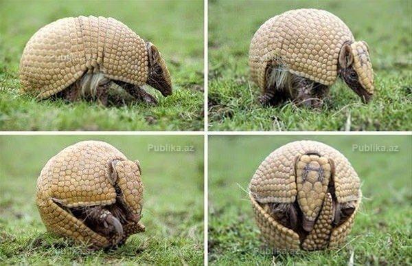1. Armadilon adlanan bu heyvan ilk baxışdan silahlı döyüşçünü xatırladır. Maraqlı bədən quruluşuna malik olan heyvan çarpaz və çoxbucaqlı pulcuqlardan ibarət sərt qabıqla örtülüdür. Ümumi quruluşuna görə tısbağanı xatırladan heyvan, ondan iki ayaq üzərində yeriyə bilməsi ilə seçilir. Armadilloların bədəni təbiətə qarşı bir növ zirehlə qorunur. Heyvanın bel nahiyyəsində yerləşən sərt pulcuqlar təhlükə qarşısında top kimi yuvarlanaq qalxan formasını alır.