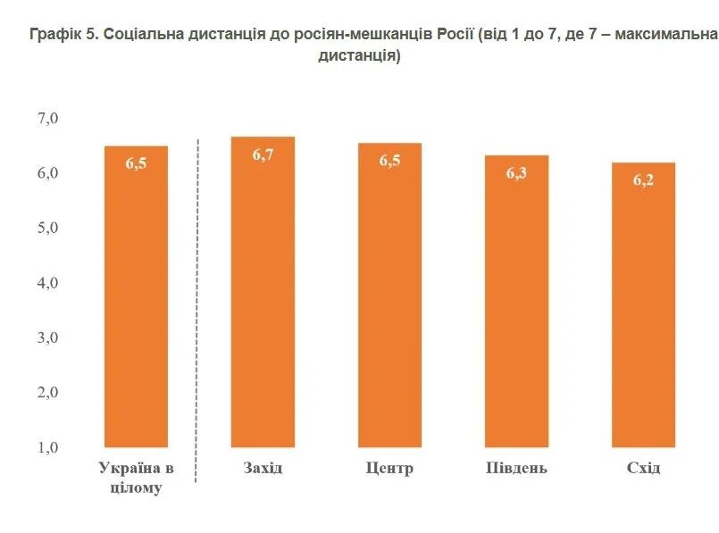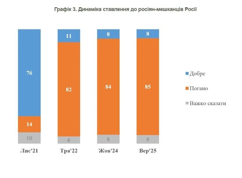 2025-ci ilin sentyabrına olan məlumata görə, bütün regionlar üzrə ukraynalıların mütləq əksəriyyəti Rusiyada yaşayan etnik ruslara mənfi münasibət bəsləyir. Onlara müsbət münasibət bəsləməkdə davam edənlərin payı 14%-dən çox deyil.