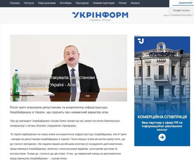 Publika.az AZƏRTAC-a istinadən xəbər verir ki, "Ukrinform" dövlət informasiya agentliyi, "İnterfaks-Ukrayna", "RBK-Ukrayna", "UNİAN", "Cenzor", "Gordon", "Ukrainska Pravda", "24tv.ua", "Korrespondent" və digər informasiya agentlikləri, xəbər portallarında dərc edilən məqalələrdə Prezident İlham Əliyevin Azərbaycan və Ermənistan arasında paraflanmış sülh sazişinə, Rusiya tərəfindən Azərbaycanın Ukraynadakı enerji infrastrukturlarına, səfirliyinə hücumlarına dair fikirlərinə, Azərbaycan və Ukrayna prezidentləri arasında keçirilən görüş yer alıb.
